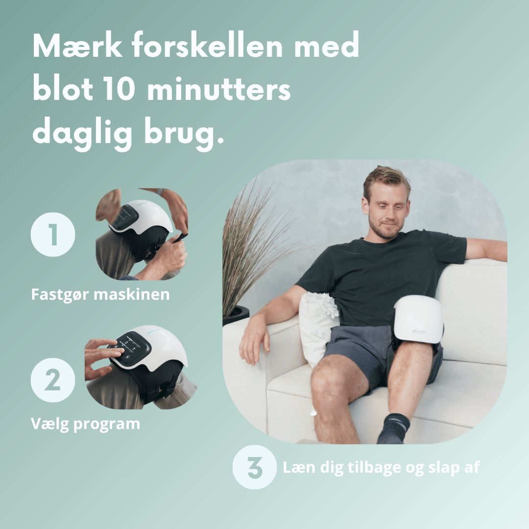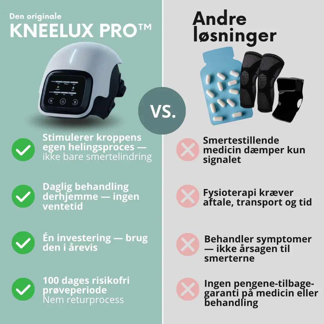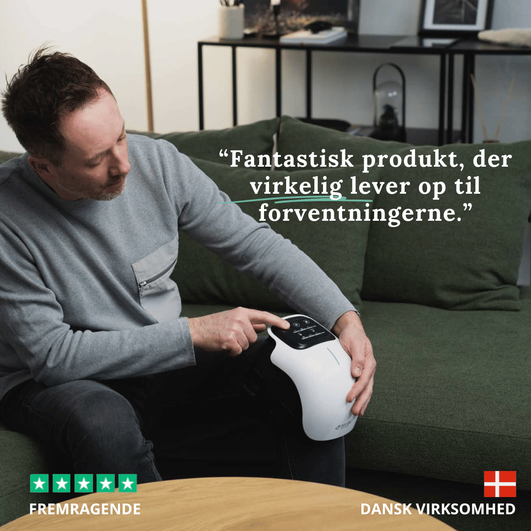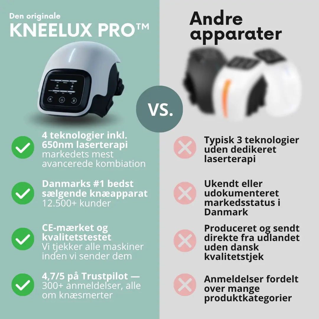 Der findes efterhånden mange knæmassagere på markedet, men de er ikke identiske med KNEELUX PRO™ – heller ikke hvis de ligner. Hverken i opbygning, tilpasning eller den samlede oplevelse. Når du vælger KNEELUX PRO™, får du også uovertruffen dansk support, førsteklasses vejledning så du er godt klædt på og en tilfredshedsgaranti, som giver dig den tryghed du skal bruge, når du kaster dig over noget nyt.
